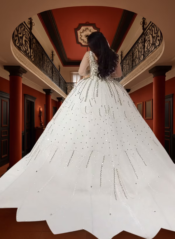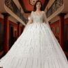 Style tip: Style with pulled-back hair and bold earrings to keep the focus on the gown’s full-body shimmer. A dramatic veil or train extension adds extra impact for the aisle or stage.