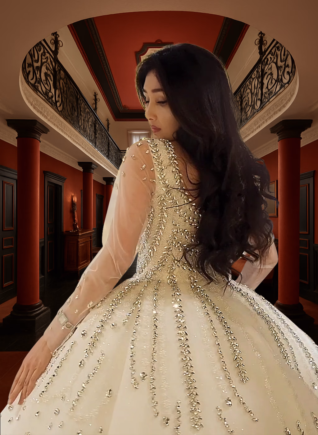 Step into your spotlight in “Diamond Dusk – غسق الألماس”, a gown designed to dazzle from every angle. Covered in intricate crystal embroidery from neckline to train, this fitted silhouette flows effortlessly into a flared hem, combining sleek modern lines with high-drama shimmer. The high neckline and long sleeves add a sense of sophistication, while the reflective embellishments catch the light like falling stars — making every moment unforgettable.
