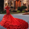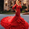 Command the night in our “Sculpted Muse – الملهمة المنحوتة”, a siren-like gown forged from passion and power. With a figure-hugging silhouette that flows into a breathtaking mermaid train, this piece features cascading ruffles, radiant embroidery, and a captivating glow. The bodice is adorned with tonal embellishments and sheer full-length sleeves, crafting a look that’s both fearless and irresistibly elegant.